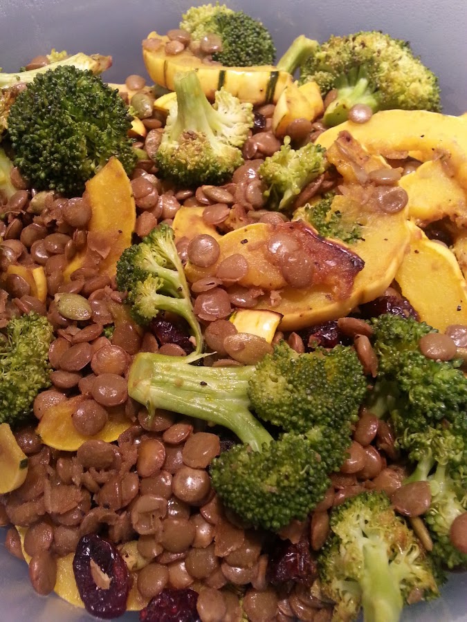 Toss the cut squash with oil, thyme sprigs, salt, and pepper and spread on a foil lined baking sheet. Roast at 375 for 30-40 minutes or until tender.   Meanwhile, toss broccoli or Brussels with oil, garlic, salt and pepper, and roast for 20 minutes or until tender.While the veggies are roasting, cook the lentils in simmering water for 20-25 minutes, or until tender. Drain and toss with a bit of olive oil and sea salt. Set aside. Allow the veggies to cool slightly, discard the thyme and garlic, then toss with lentils, pepitas, cranberries, and dressing. Serve immediately.