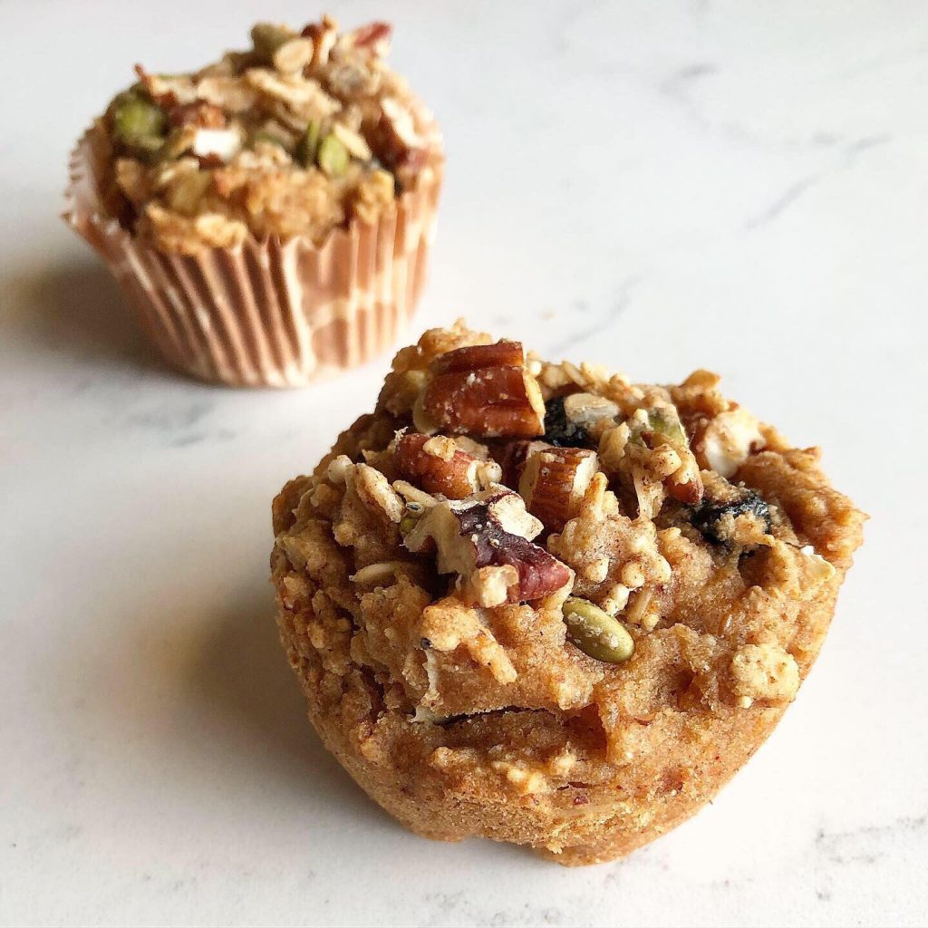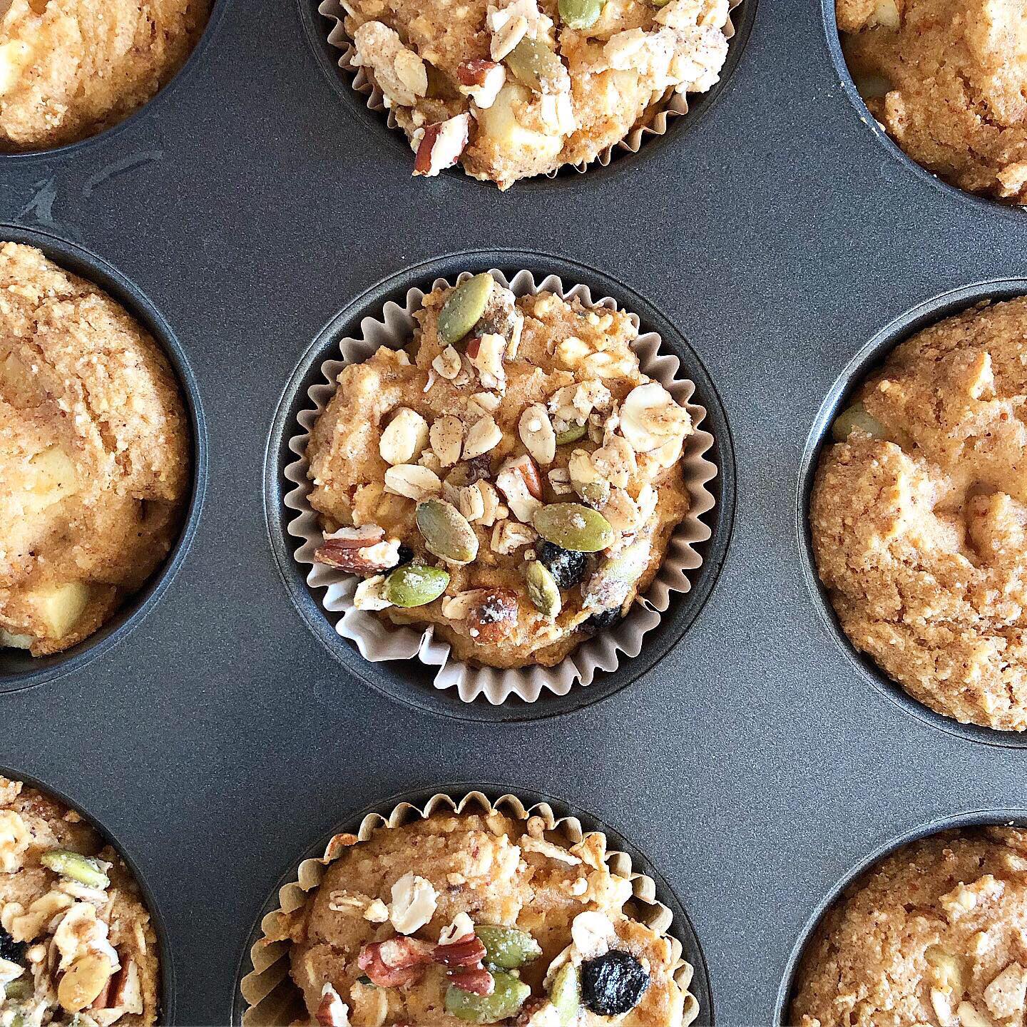 Let the flax eggs thicken for 5 minutes. Stir in the next 5 ingredients. Add the dry ingredients and mix well. Gently stir in the milk, and apple if using. Pour into muffin liners. Combine topping ingredients and sprinkle each muffin with mixture. Bake at 350 degrees for 18-22 minutes, or until springy to the touch. Best enjoyed warm.