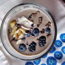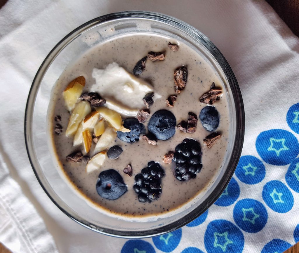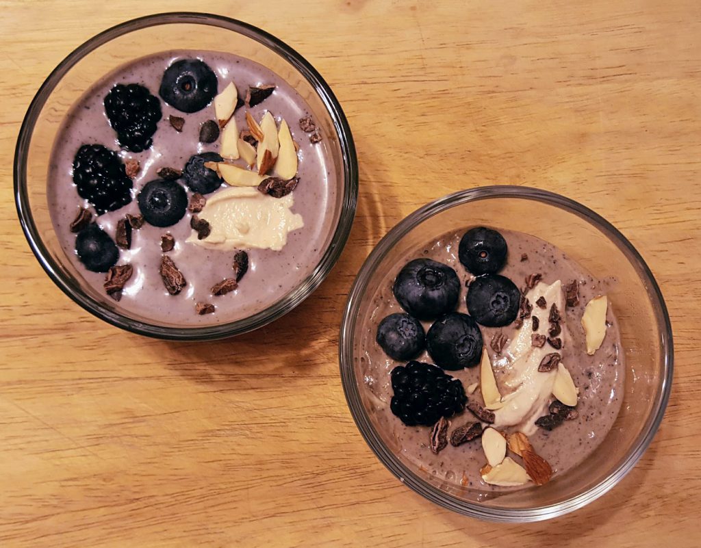 Ashley’s Variation: I used homemade cashew milk instead of almond milk. I also blended the chia into theĀ milk with 3/4 c blueberries Ā (and reduced the milk to 1 1/4 c) Ā for aĀ smooth creamy texture and pretty purple hue. And I garnished with a dollop of additional cashew cream (as seen in my photos)
