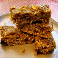 Press the mixture into a parchment lined glass dish, such as a 6×4 inch shallow Pyrex dish. Refrigerate until firm then cut into bars.