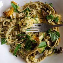 Stir in the pasta and zucchini noodles, thinning the sauce with pasta water to reach the desired consistency.