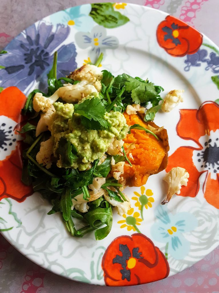 To assemble: Slice and gentle mash the warm potato(es). Top with the veggie mixture, then the avocado.