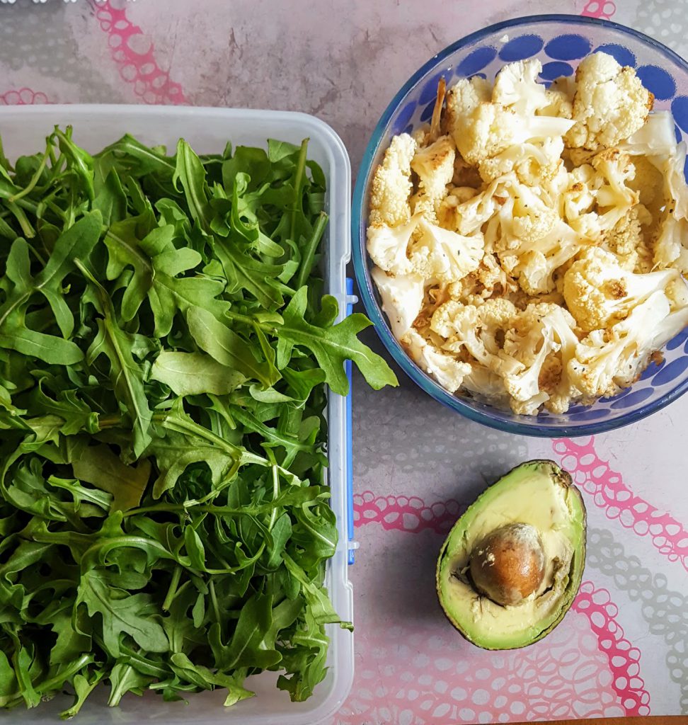 Reserve half the cauliflower for another use and toss the arugula with the remaining cauliflower
