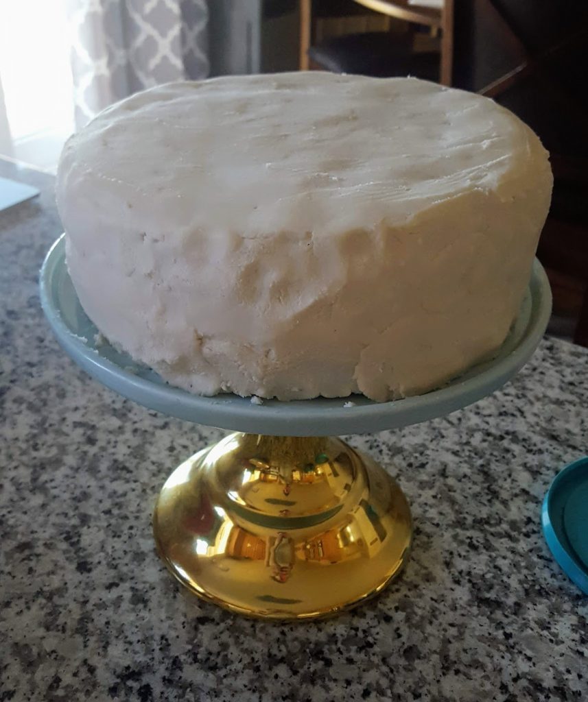 The bottom cake was assembled on the cake stand so it wouldn’t have to be moved later. I spread a generous amount of the blueberry jam between the layers and frosted the cake with the white frosting. Sidenote: I actually meant to frost the bottom with the darker frosting and white on the top cake but I accidentally reversed the colors 😉