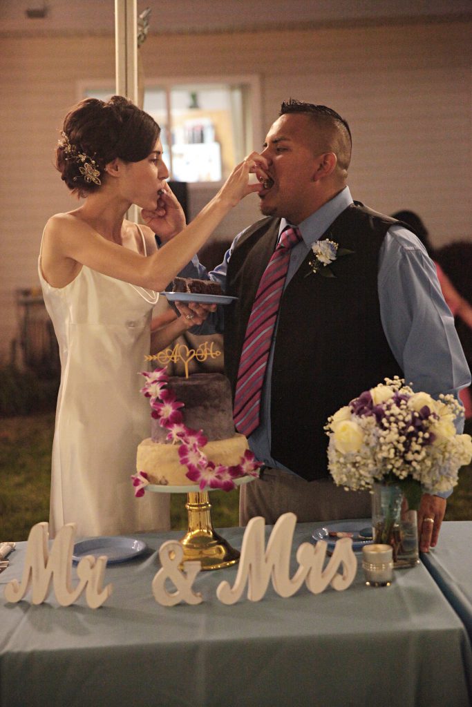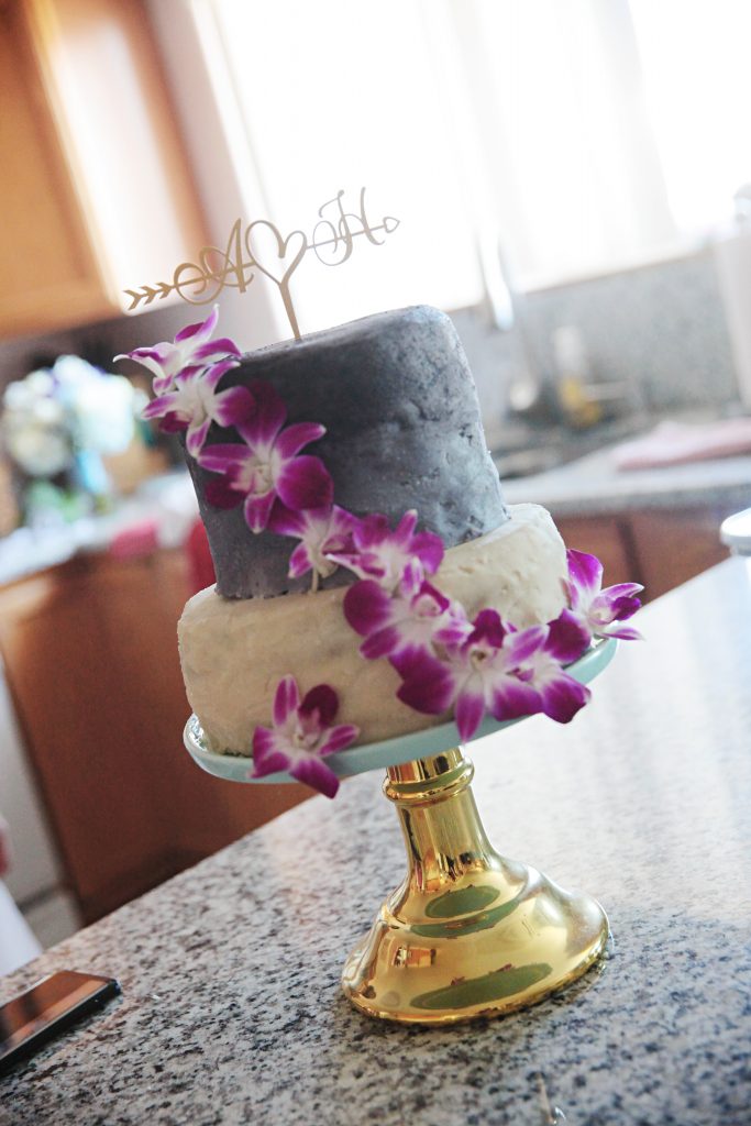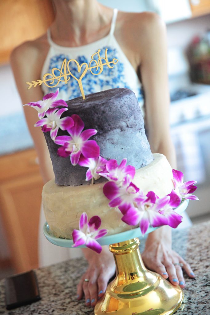 I made a 2-tier wedding cake free from gluten, dairy, eggs, and refined sugar. The bottom layer was a 2 layer 9” vanilla cake and the top a 3 layer 6” chocolate cake.