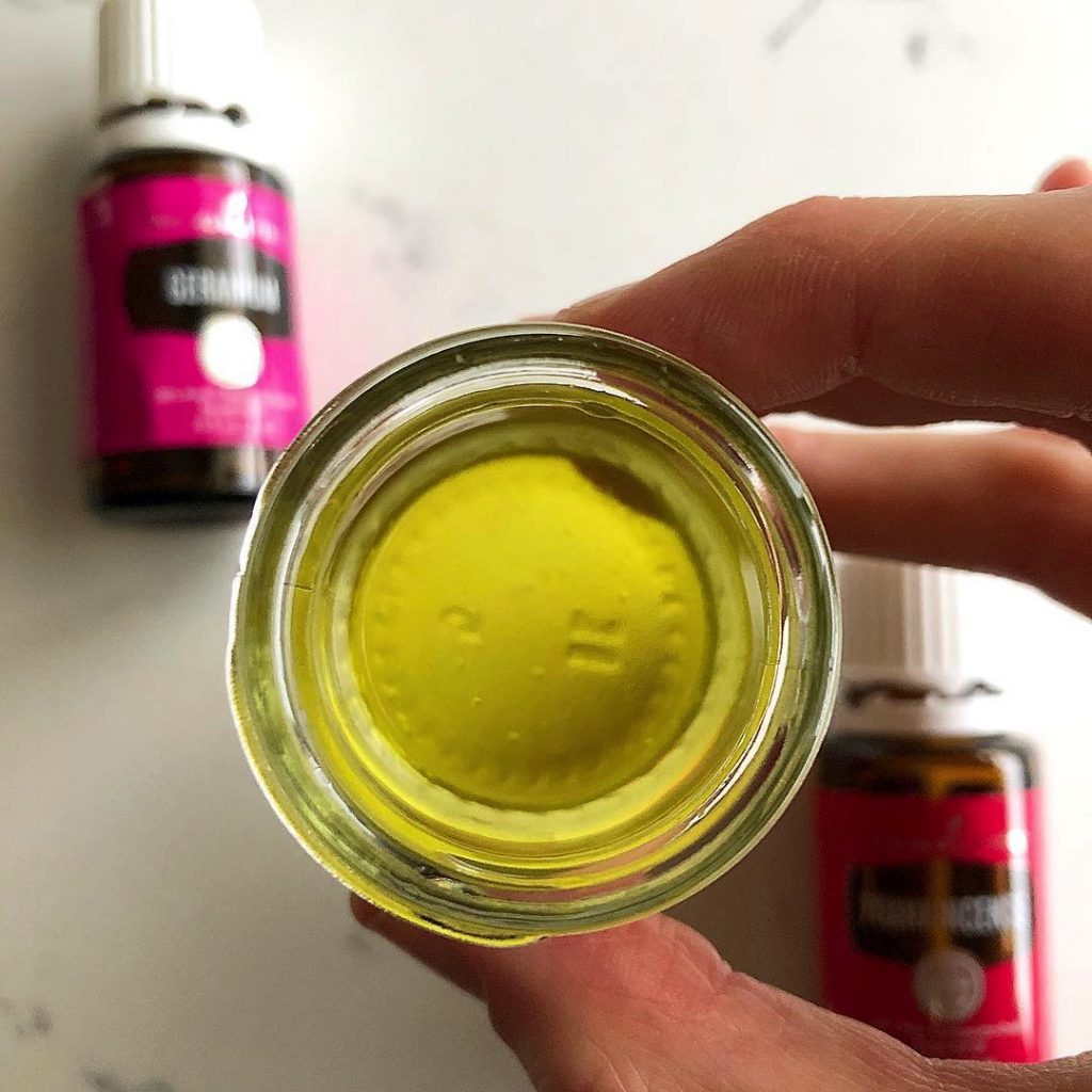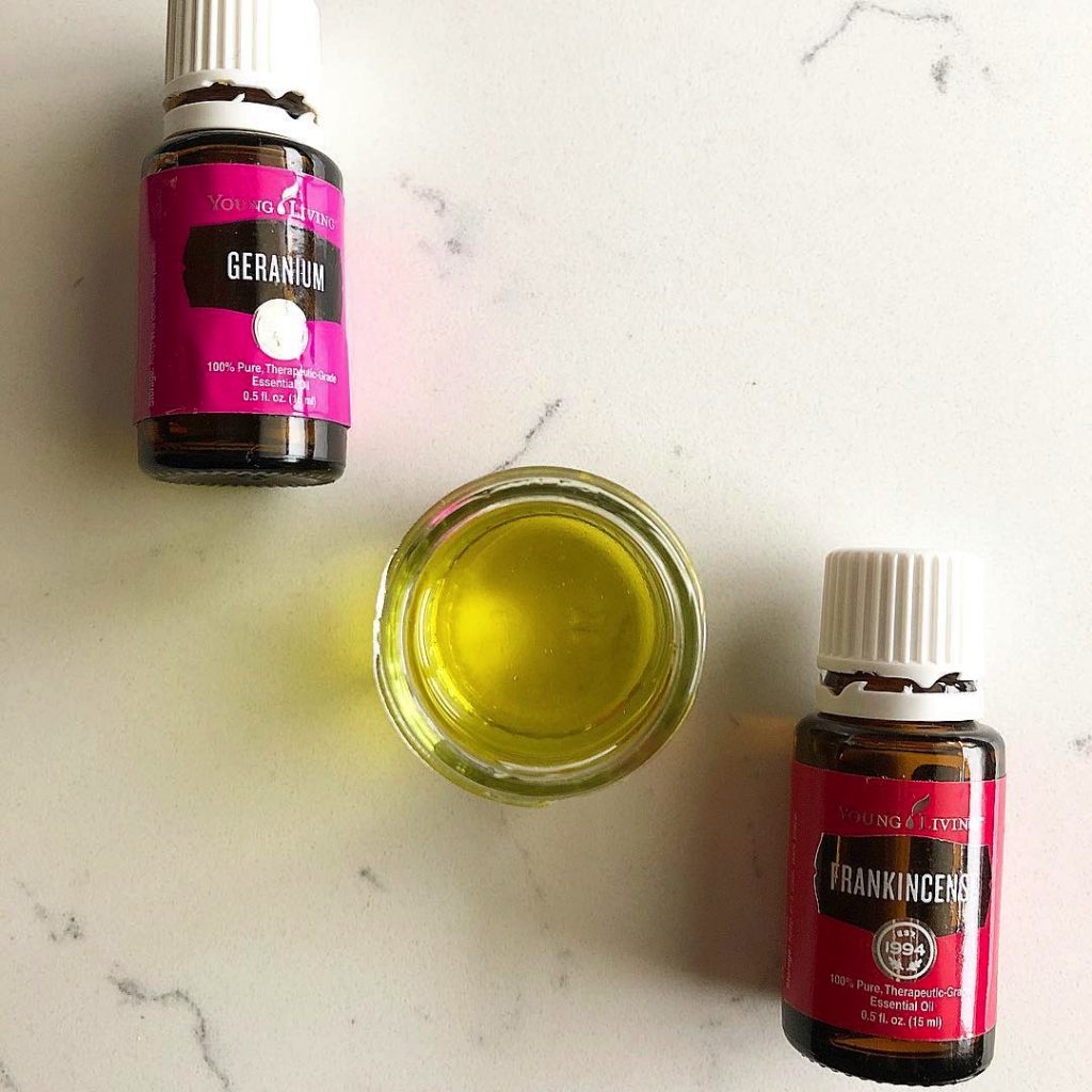 4-5 drops each orange, lavender, geranium + frankincense oil