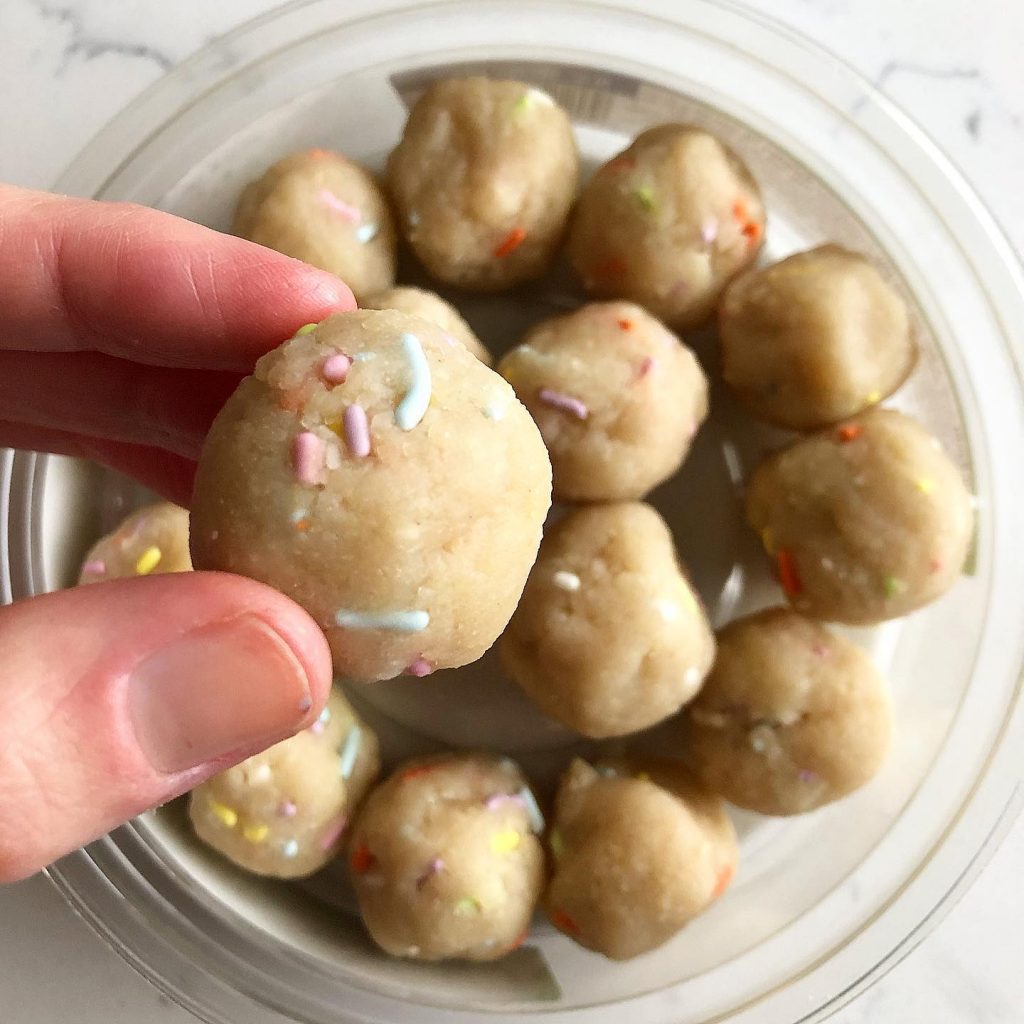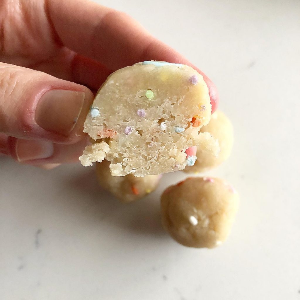 And although it’s not practical to bake a cake or make homemade ice cream everyday, it IS TOTALLY DOABLE to snack on NO-BAKE FUNFETTI CAKE BITES any time – or all the time ?!!!