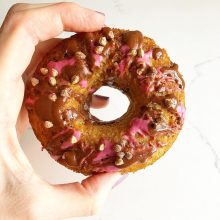 And a donut just isn’t a donut without a glaze or icing so these beauties are covered with both a creamy lavender glaze (tinted pink/purple with beet powder) and dark chocolate drizzle for a dessert-worthy treat! Feel free to use just one of the two, if you prefer 😉