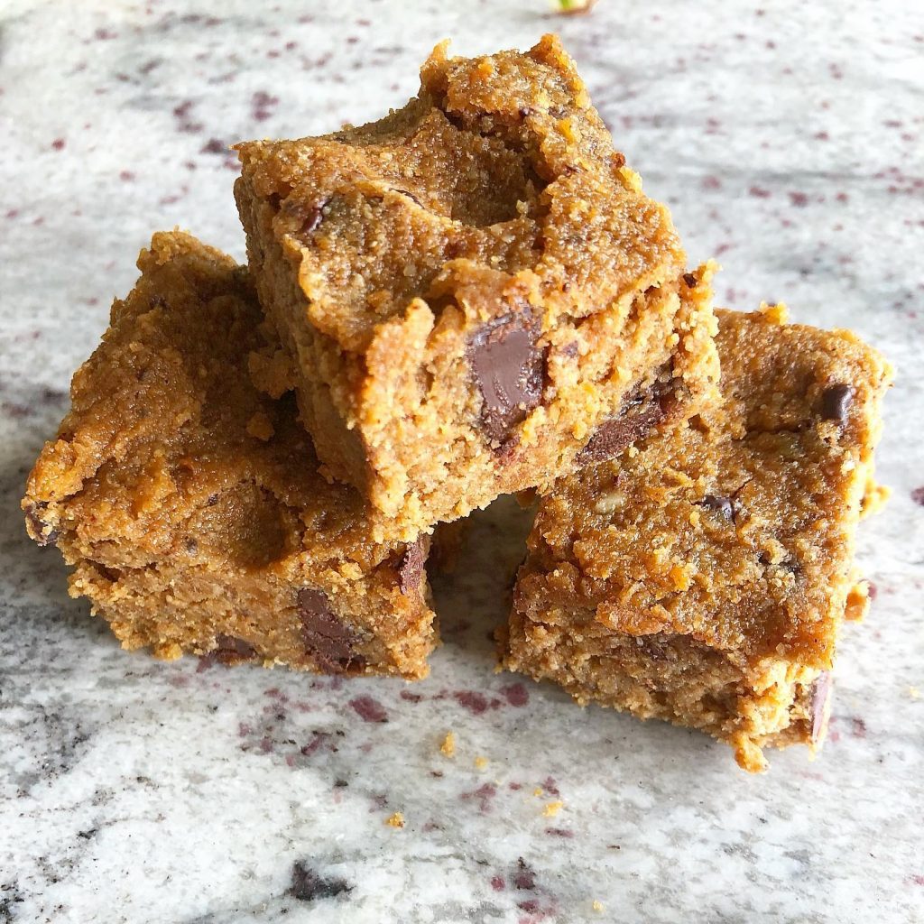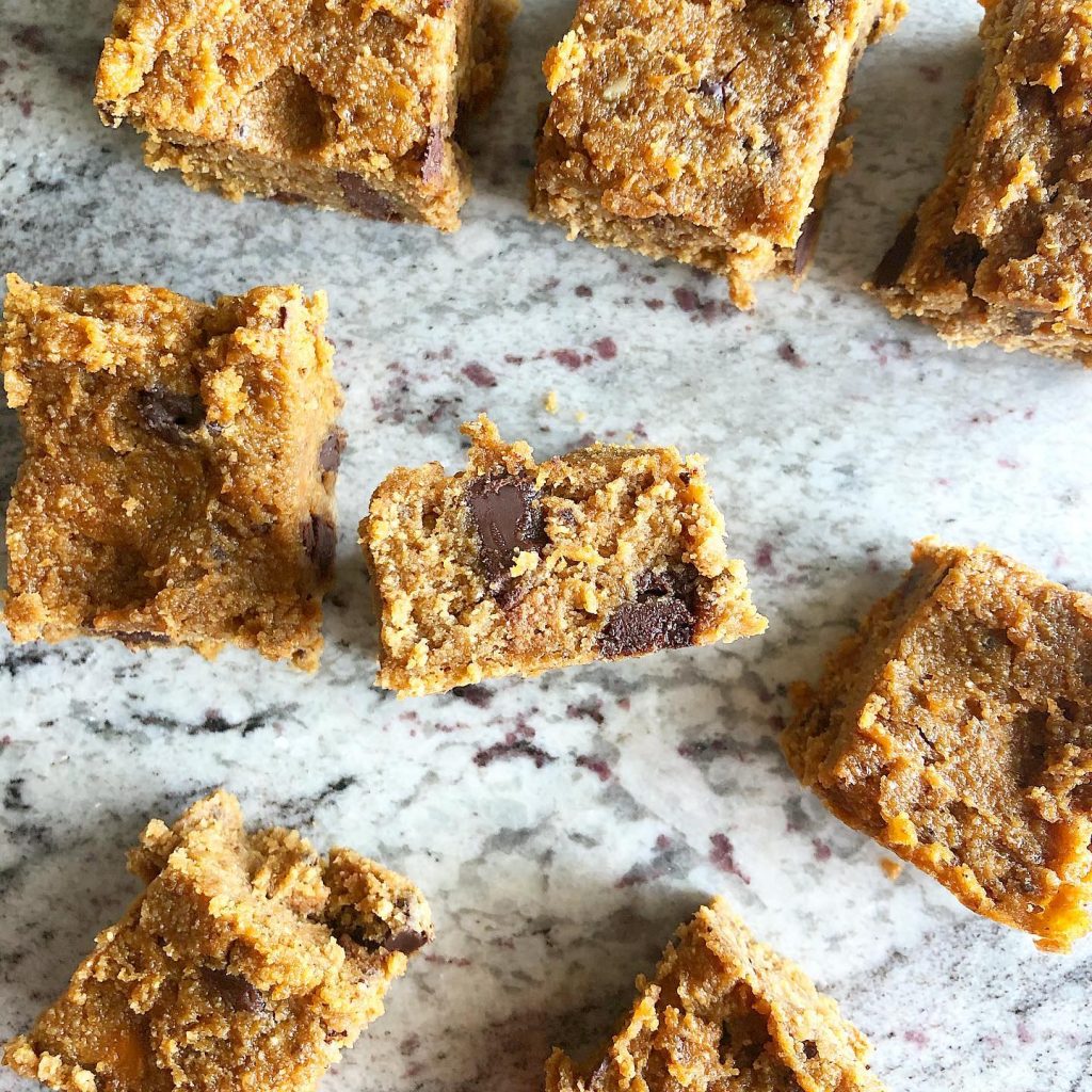 Then an unlikely combination of ingredients (shoutout to sweet potato and nut butter!) swirled in my Vitamix created a sweet, sticky dough that I thought may make a tasty baked good. Turns out, these are just as delicious (and arguably better) than the nostalgic blondie that we know and love.