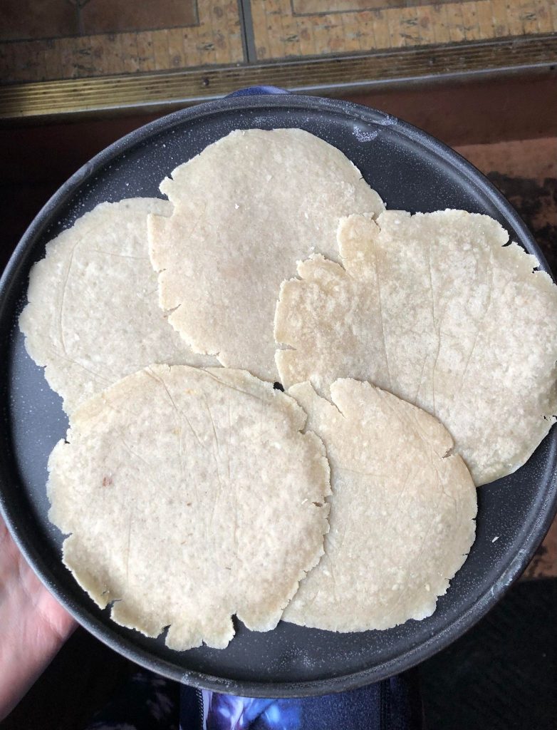 Form into gold-size balls and roll out between parchment paper or use a tortilla press to reach 1/8โ€ thickness.